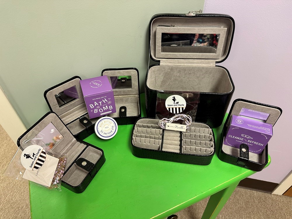 Old Whaling Co. French Lavender Bath Bomb Old Whaling Co. French Lavender Body Butter Old Whaling Co. Clean and Calming Cleanse and Refresh Bar Simply Noelle Lavender and Gold Bracelet Simply Noelle Lavender and Gold Necklace Black Leather Jewelry Travel Train Case