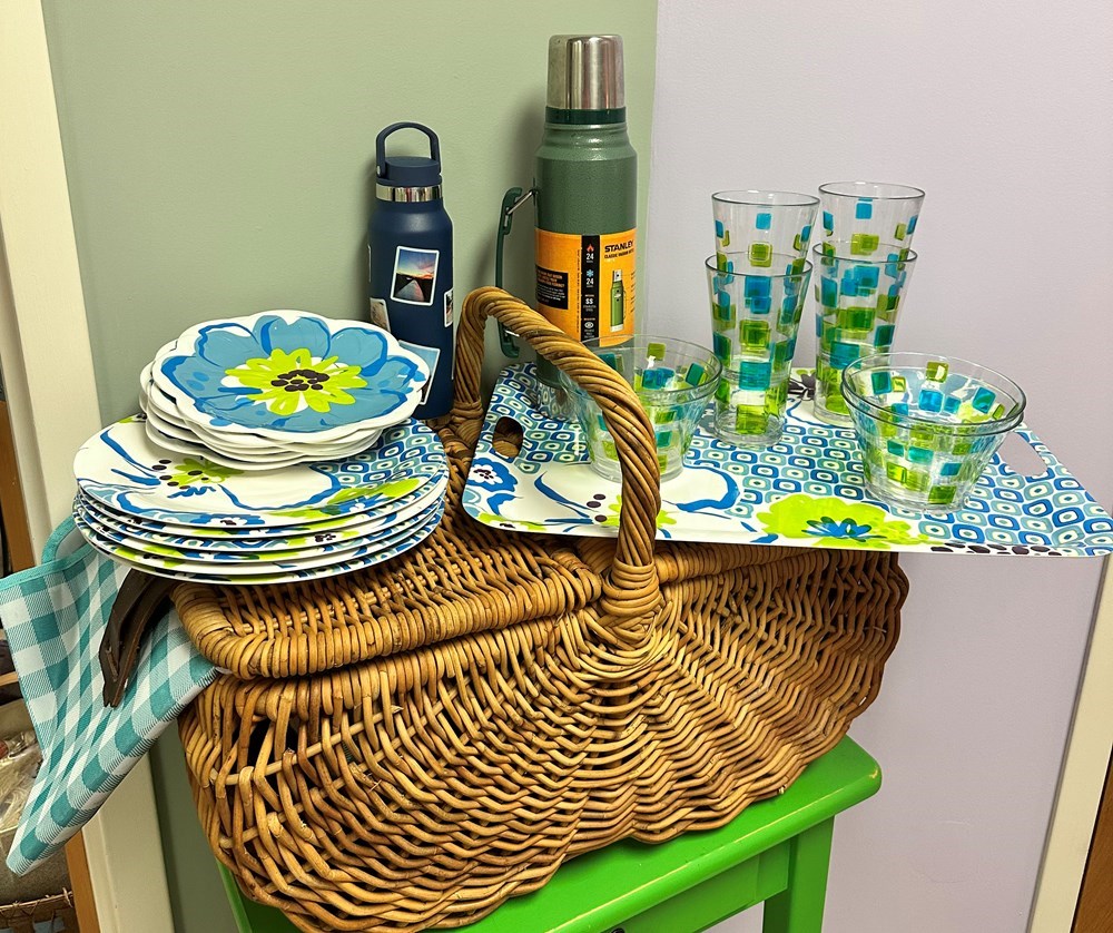Large antique 1940's picnic basket Pier 1 Accessories (blue and green) include: 4 acrylic glasses 4 acrylic bowls 6 melamine dinner plates 6 melamine salad plates 1 large matching platter Stanley Classic Vacuum Bottle H2Go Insulated Bottle Matching picnic blanket