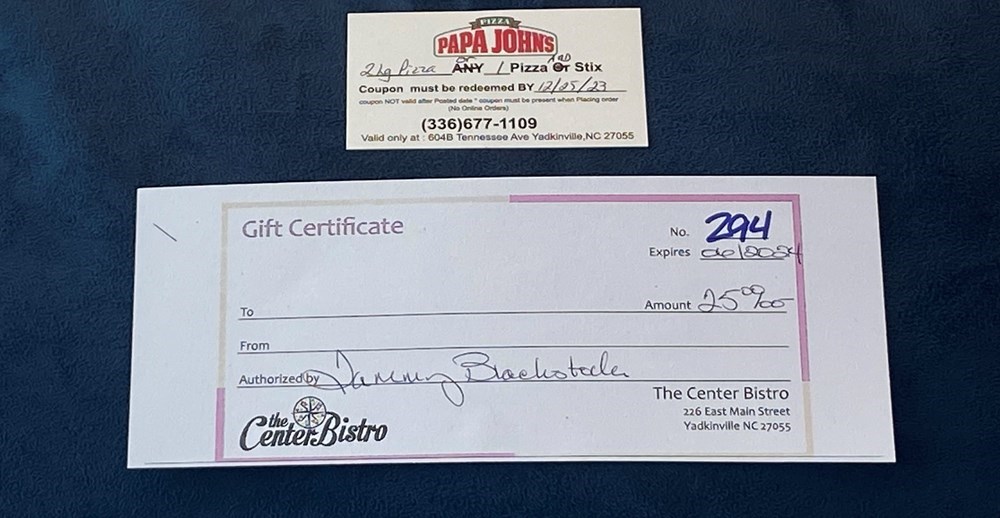 Donated by: The Center Bistro and Papa John's-Yadkinville