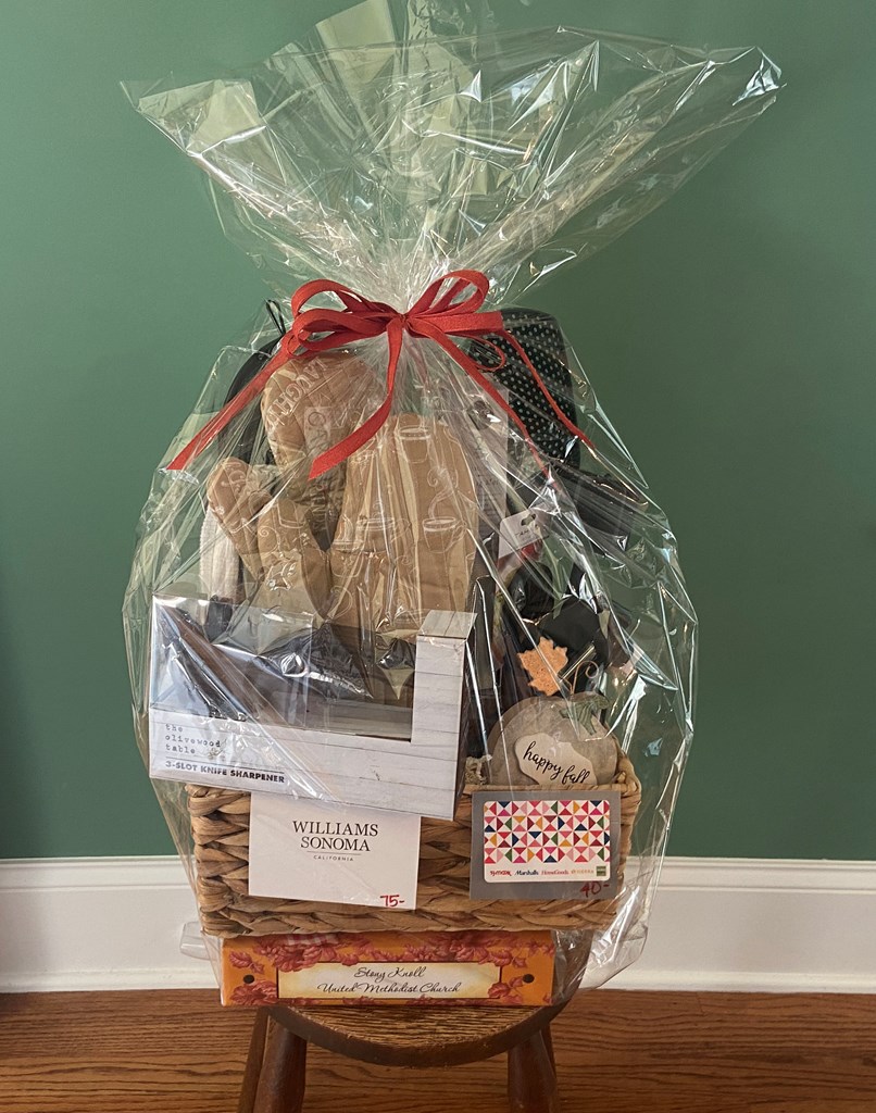 $75 Williams Sonoma gift card $40 Home Goods gift card Stony Knoll United Methodist Church UMW cookbook Knife Sharpener Strainer Can Opener Kitchen Scissors Avacado Masher Vegetable Peeler Baking Mat Handled Strainers Kitchen Towels and Pot Holders Fall Pumpkin decor