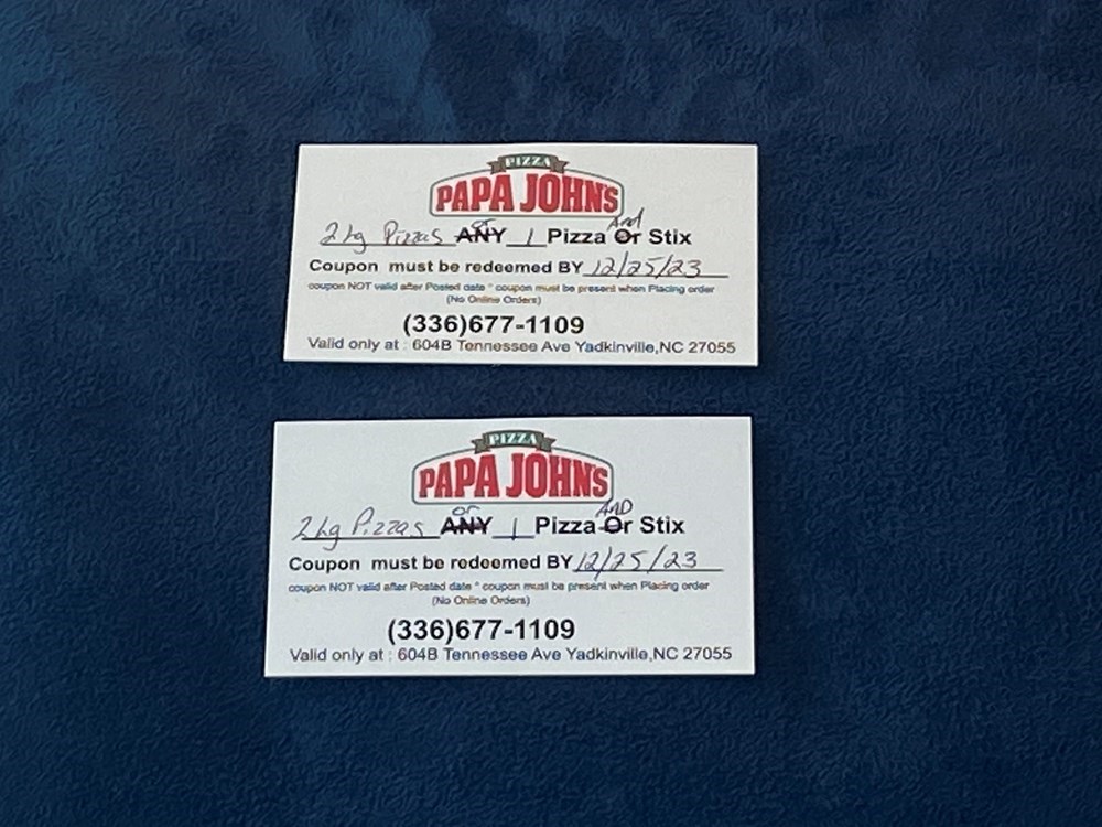 (2) Papa John's gift certificates for 2 Large Pizzas and Stix each