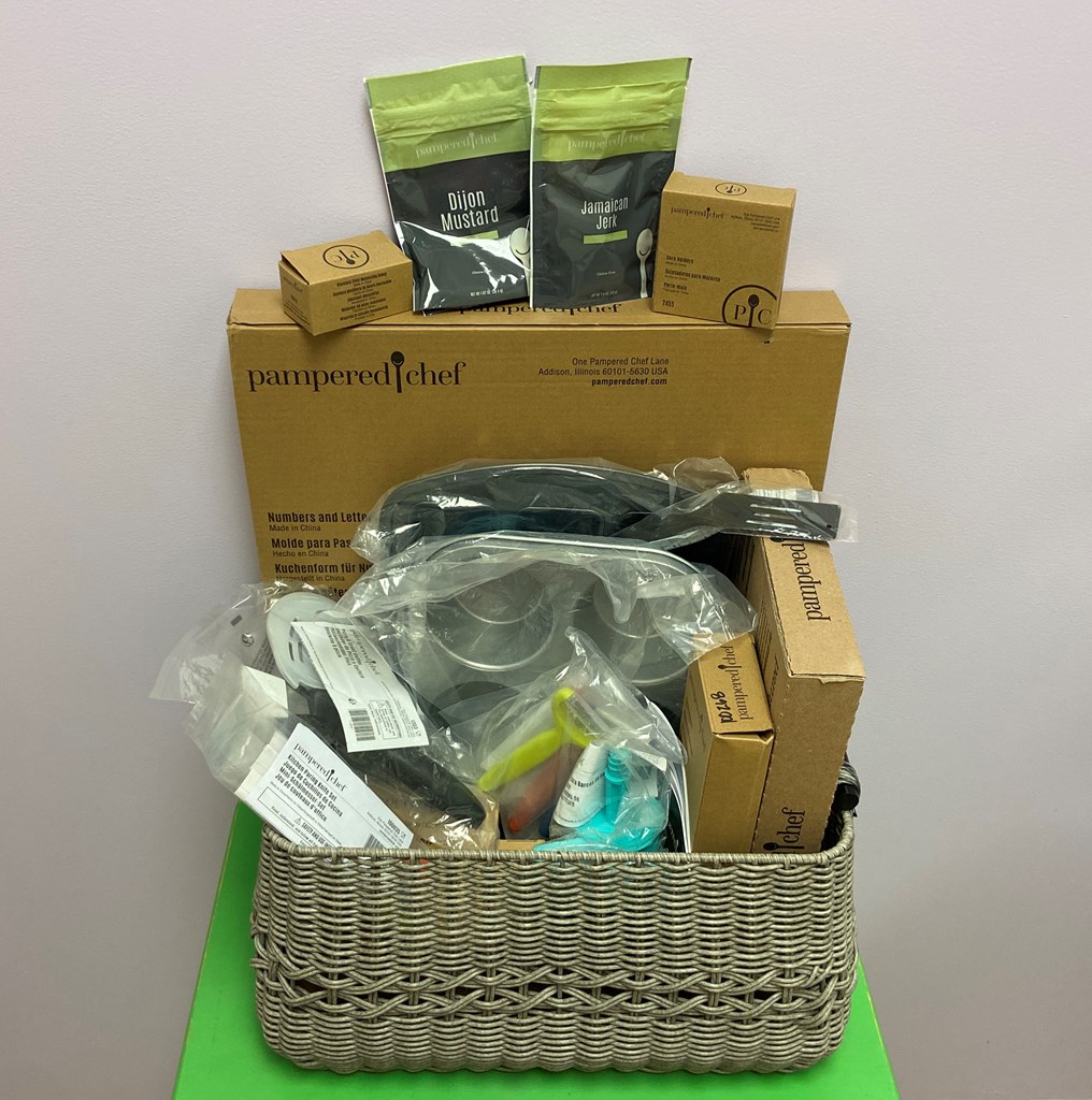 MANY Pampered Chef Products including: Numbers and Letters Cake Pan, Medium Stone Pan, Potato Masher, Brownie Pan, Large Muffin Pan, Silicone Prep Bowls (set of 3) Wine Tumbler, Stainless measuring scoop, Corn Holders, Pizza and Crust cutter, Scampi Mix, Dijon Mustard Mix, Jamaican Jerk Mix Spreader, Kitchen Paring Knife Set, Boat Press Set, Mini Serving Spatula, Basket